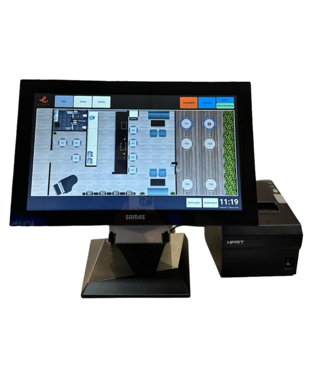 Das Ecash Posterminal ist speziell für die Gastronomie entwickelt und vereint Design und Nachhaltigkeit. Der 15-Zoll-Touchscreen ist spritzwasserdicht und für die Verwendung mit feuchten Fingern geeignet. Dank des vollständig flachen Bildschirms ohne Rand lässt sich die Reinigung einfach mit einem leicht feuchten Tuch durchführen.